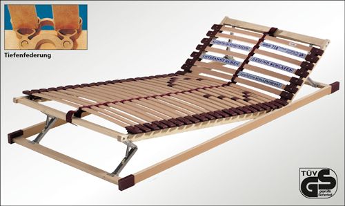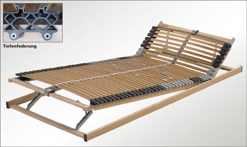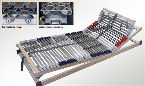 - Federelemente auf massiver Buchenleiste gelagert, dadurch auch bei Überbreiten kein Durchbiegen im Mittelbereich oder bei 2 nebeneinander liegenden Lattenrosten, ohne störenden Übergang in der Mittelzone