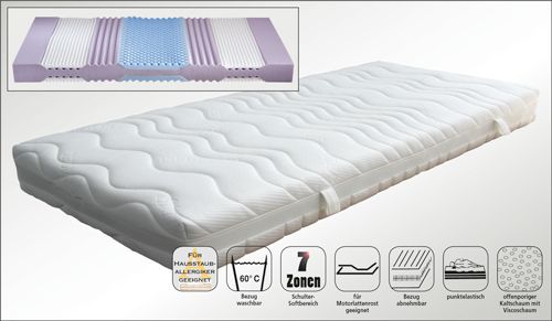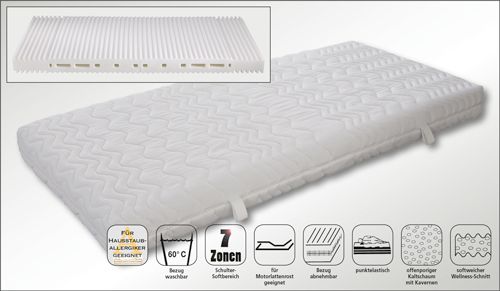 Sehr komfortable 7-Zonen Kaltschaummatratze, optimale Anpassung und Stützkraft durch Spezialwürfelschnitttechnik, lange Lebensdauer, sehr flexibel, Härtegrad 2, 3 und 4 lieferbar, auch für schwergewichtige Personen geeignet, besonders für Motorlattenroste geeignet.