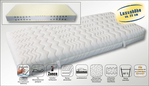 Besonders komfortable 7-Zonenmatratze mit saftiger, druckentlastender Viscoschaumabdeckung und stützendem Beckenbereich für allerhöchste Ansprüche und erholsamen Schlaf.