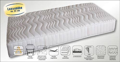 Besonders komfortable Tonnentaschenfederkernmatratze mit ca. 1700 Federn (bei 100/200) + anspruchsvoller Vitalpunkt-Kaltschaumabdeckung. Lange Lebensdauer, hervorragende Anpassungsfähigkeit und optimale Belüftung garantiert einen erholsamen Schlaf.
